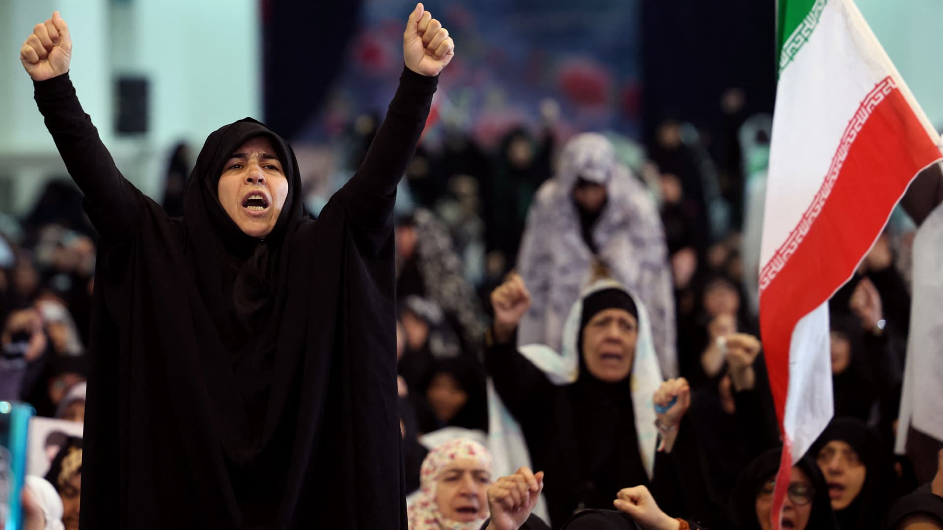 Iranian Shia women shout slogans during Eid al-Fitr prayers, marking the end of the Muslim holy month of Ramadan, at the Grand Mosalla mosque in Tehran on March 21, 2026.