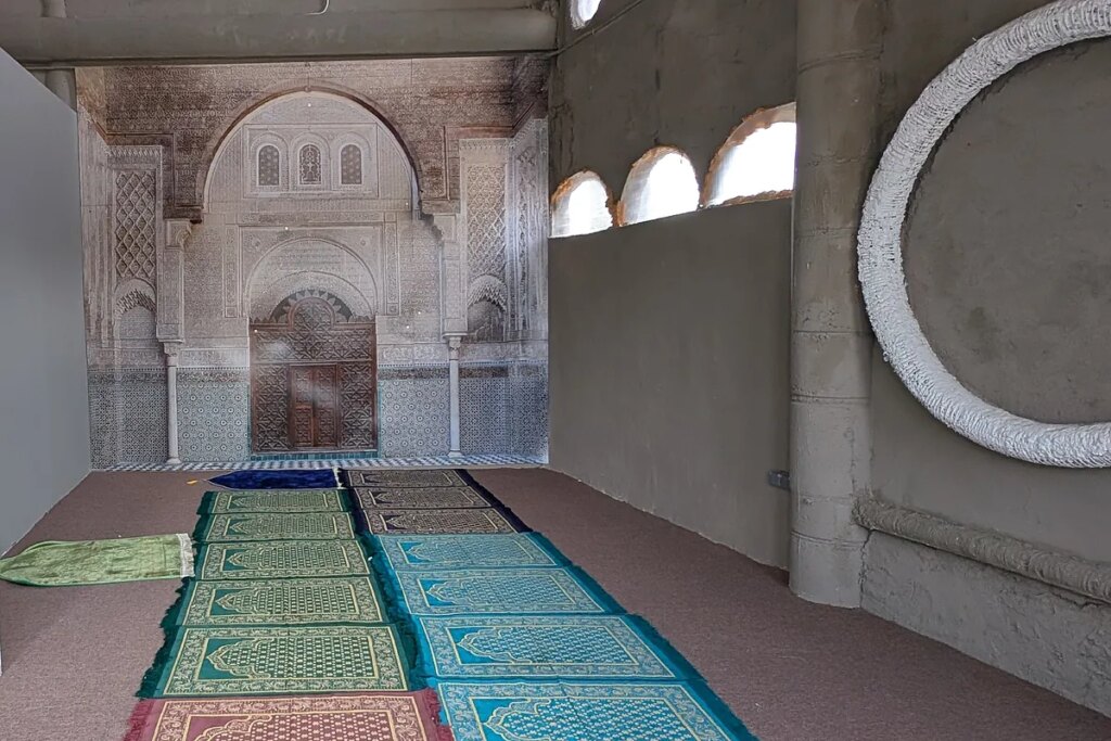 Alfombras para el rezo, varios ejemplares del Corán escritos en árabe y una versión gratuita traducida y comentada al castellano reposan sobre un mueble situado junto a la puerta de la mezquita que la asociación Mensajeros de la Paz ha abierto en lo que antaño fue el baptisterio de la catedral que Justo Gallego construyó con sus propias manos en Mejorada del Campo. En el extremo opuesto a la entrada —donde un cartel pide a los visitantes que «tengan la amabilidad de descalzarse antes de entrar» para cumplir con el precepto jurídico de la tahara que marca el islam— se encuentra una imagen de la mezquita Aljama de Córdoba impresa en vinilo sobre la pared. Mientras tanto, en el ambiente suena un hilo musical de cantos gregorianos, y una mampara fija separa este espacio del que, al otro lado, es una sinagoga con un vinilo del muro de las Lamentaciones de Jerusalén. En ella, una vieja Biblia hace las veces de Torá dentro de esta mitad de la sala, donde una lona semicorrida separa la imagen de los restos del templo de Salomón de un crucifijo, situado tras una mesa a modo de altar con varias sillas.