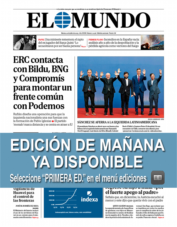 La experiencia El Mundo más completa: tu periódico en papel de lunes a domingo. Además disfruta de la edición digital con Orbyt, cada día disponible a partir de las 00h en pdf, y accede de forma ilimitada a todo el contenido Premium en la web. Comparte El Mundo con tu familia para estar informados antes que nadie, en cualquier momento, lugar y formato.