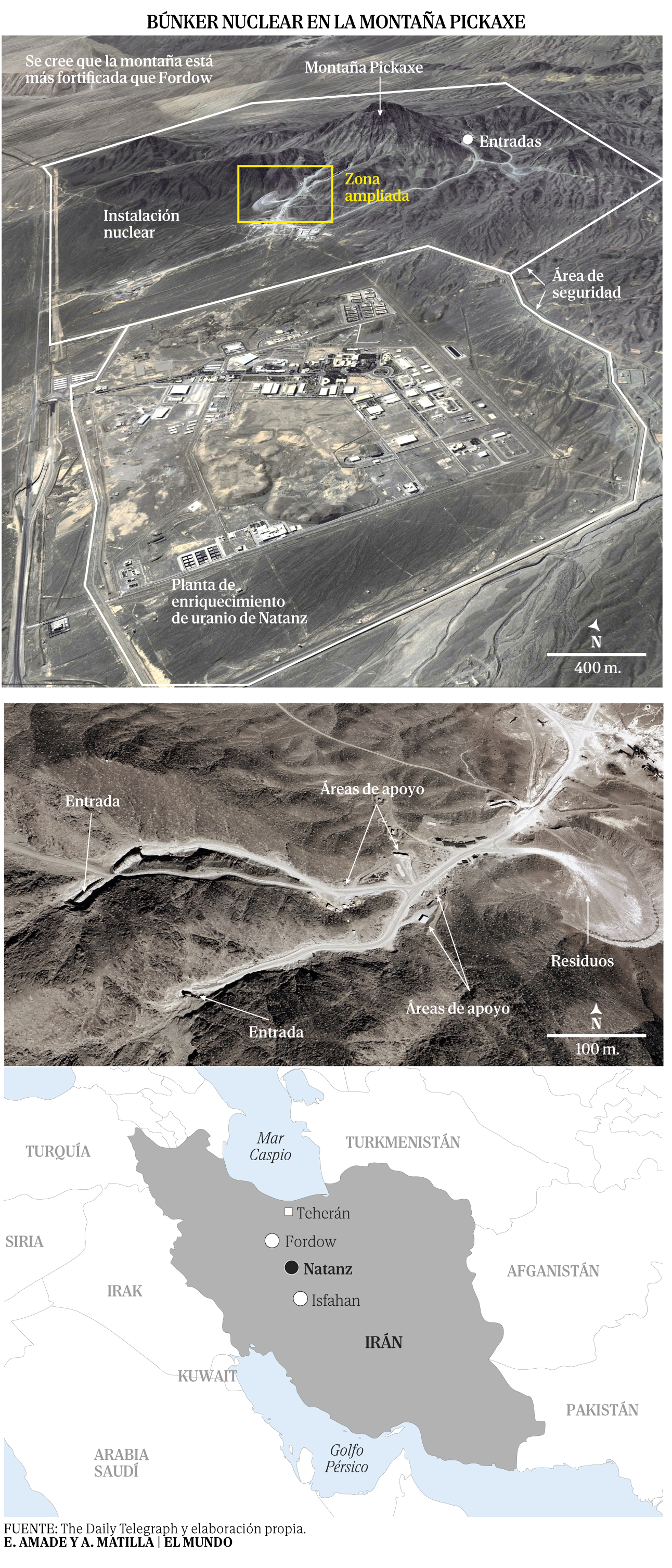Informes estadounidenses aseguran que Teherán tiene acceso al uranio en la planta de Isfahás, por lo que podría recuperar el material pronto y esconderlo en otro lugar. El presidente de EEUU, Donald Trump, aseguró el lunes que Irán «intenta reactivar su programa de armamento en otro emplazamiento», que describió como un lugar «protegido por granito». Los expertos creen que Trump aludía al monte Pickaxe, cerca de la planta de Natanz, en el corazón del país, donde Irán estaría construyendo instalaciones nucleares en una planta situada a cien metros bajo tierra, protegida por la orografía del lugar.