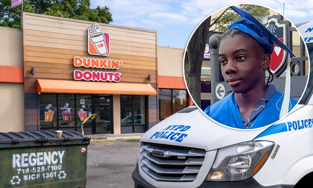 A 13-year-old boy was shot in the head outside a Dunkin' Donuts near Springfield and Linden Blvds. in Cambria Heights, Queens on Monday, Sept. 22, 2025. (Theodore Parisienne / New York Daily News)