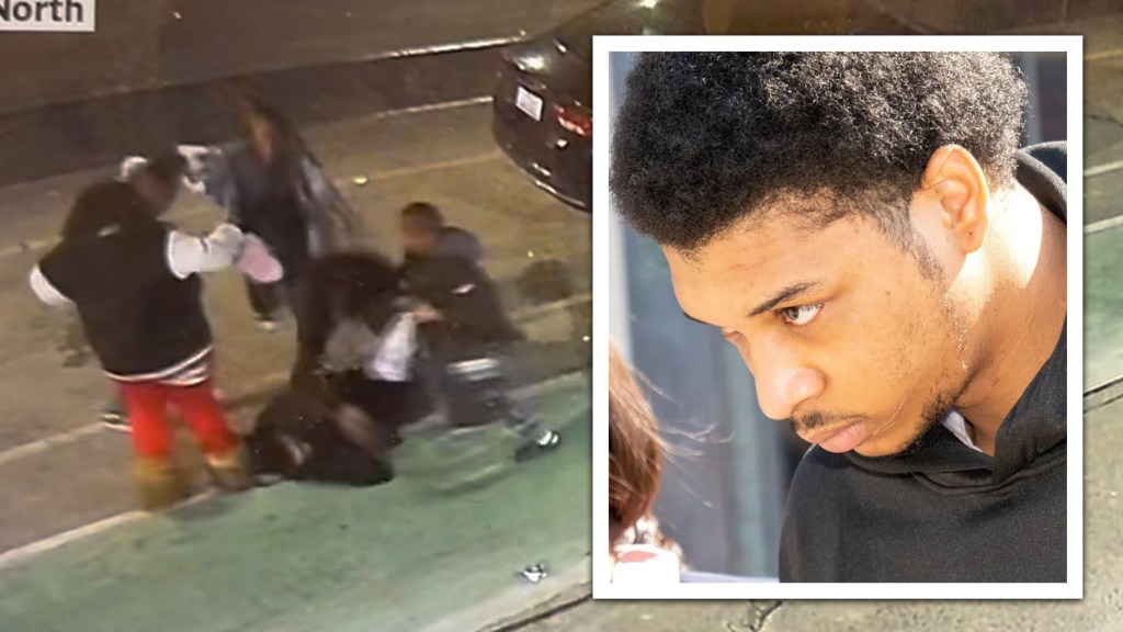 Surveillance video shows Veo Kelly being attacked by a mob shortly before stabbing two people, killing one of them, according to his attorney. (Obtained by Daily News)